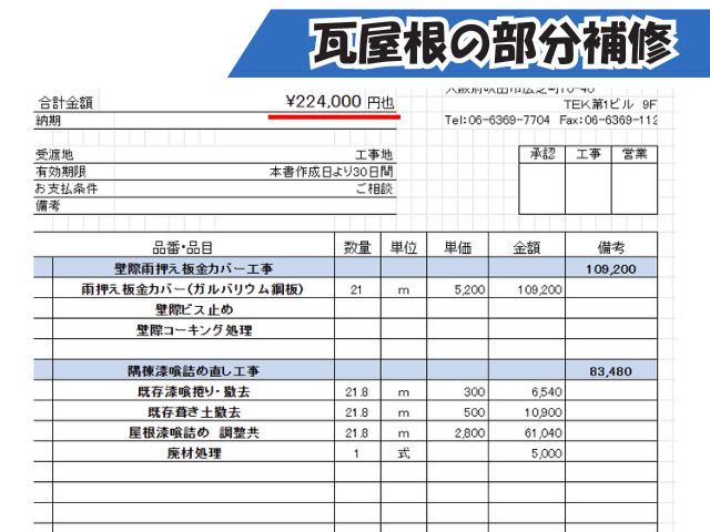 「うちもこれぐらいかかるのかな?」と気になる方のために、吹田市のお客様にご提示したお見積書の一部を3例ご紹介します。