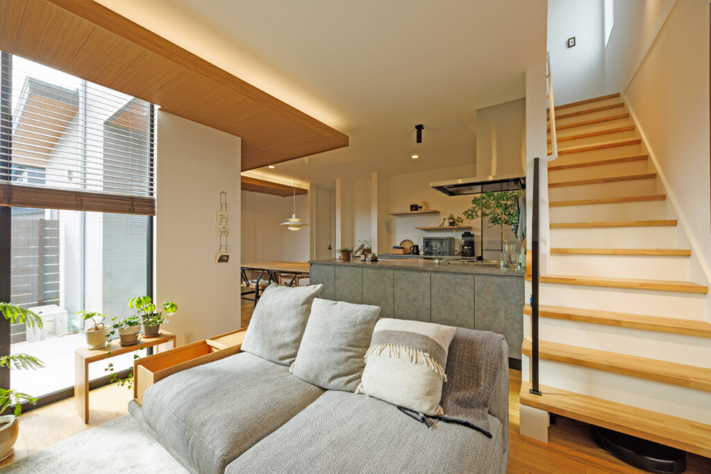 リビングフロアを囲む下がり天井は、天井からの高さや奥行き、光の漏れ具合など細部までこだわりました。ブラインドから光が差し込む昼下がりのリビングはカフェ気分を堪能できます。